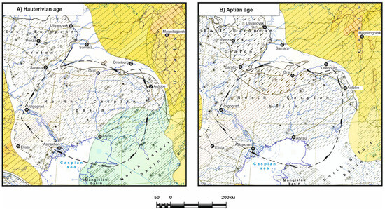 Paleogeographic reconstruction of the North Caspian Basin of the Early Cretaceous epoch: Hauterivian age (A) and Aptian age (B) (modified after [22,23,24]).