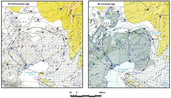Turonian Age: In the Turonian, especially in its second half, there was a further expansion of the Russian Sea. In the Ulyanovsk region, where the Cenomanian is absent, the occurrence of Upper Turonian white coarse chalk on the ancient Mesozoic has been established. In a number of places, a break in the deposits between the Cenomanian and Turonian is clearly established: for example, in the Caspian region (Figure 9B), in the north of the Black Sea basin, and so on.