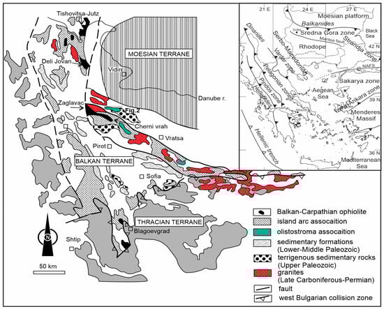 - Dabovski, C.H.; Zagorchev, I. Chapter 5.1. Introduction: Mesozoic evolution and alpine structure. In Geology of Bulgaria; Zagorchev, I., Dabovski, C., Nikolov, T., Eds.; Academic Publishing House “Marin Drinov”: Sofia, Bulgaria, 2009; Volume 5, part 2. Mesozoic geology; pp. 13–37, (In Bulgarian with English abstract). [Google Scholar]