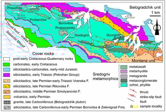 Simplified geological map of the Sredogriv metamorphics according to [16,17] showing the locations and numbers of the studied samples. The Montana unit is located between the bordering thrusts of the Vratsa and Belogradchik units.