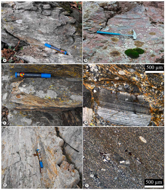 Field photographs and microphotographs of the studied metamorphic and non-metamorphic rock samples of the Sredogriv metamorphics and its immediate sedimentary cover: (a) folded quartz–chlorite–sericite schist; (b) breccia-conglomerate sample L15; (c) metaconglomerate sample L4; (d) a microphotograph of sample L4; (e) metaalbitophyre sample L1a; (f) a microphotograph of sample L1a. Mineral abbreviations: qz, quartz; pl, plagioclase; chl, chlorite; ms, muscovite (sericite); hem, hematite.