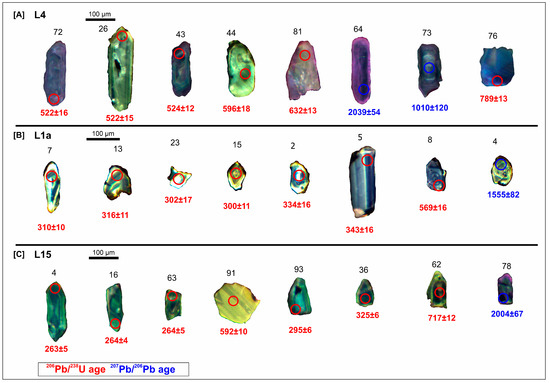 Selected cathodoluminescence images of dated zircons in the studied samples: (A) sample L4; (B) sample L1a; (C) sample L15. The numbers refer to zircon numbers in Table S1.