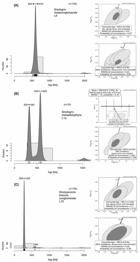 The dated zircons in the breccia-conglomerate sample L15 vary in size from 80 µm to 300 µm. They display semi-rounded shapes and mostly oscillatory-zoned patterns, which is characteristic for a magmatic origin (Figure 5C). In this sample, the 206Pb/238U ages obtained from 100 analyses range from 2009 Ma to 261 Ma (Figure 6C). From eighty-three concordant zircons, a series of clusters were established with different densities and various ages. The main age cluster of twenty zircons yielded a concordia age of 279.5 ± 1.5 Ma, followed by a cluster of thirteen zircons that gave a concordia age of 285 ± 1.6 Ma, and a cluster of twelve zircons with a concordia age of 271.5 ± 1.6 Ma. Eleven concordant zircons cluster at 292.5 ± 1.7 Ma, seven concordant zircons cluster at 267.4 ± 1.8 Ma, five concordant zircons cluster at 264 ± 2.5 Ma, four concordant zircons cluster at 590.6 ± 6.6 Ma (Figure 6C) and three concordant zircons cluster at 276.1 ± 2.6 Ma. Single zircons yielded concordant ages at 2009 ± 25 Ma, at 720 ± 12 Ma and at 323.5 ± 5.8 Ma (see Table S1). The five youngest concordant zircons demonstrated an age of 263.3 ± 1.9 Ma, hence their latest middle Permian maximum depositional age (Figure 6C). The Th/U ratios of the dated zircons in this sample range from 0.23 to 0.96, testifying to a magmatic origin.