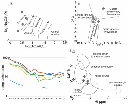 (a) log SiO2/Al2O3 vs. log Na2O/K2O classification diagram according to [51]; (b) discriminant function diagram according to [52] of major elements for evaluating the provenance; (c) chondrite-normalized REE diagram (chondrite values according to [50]); (d) La/Th vs. Hf diagram to discriminate the source rocks according to [53].