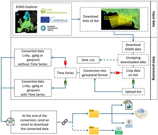 In the end, the format of the converted products can be defined by choosing between the following: (i), Shapefile (.shp), an ESRI geospatial format [63]; (ii) GeoPackage (.gpkg), an open format of geospatial datasets [64]; and (iii) GeoJSON (Geospatial Javascript Object Notation—.geojson) [65]. The GeoJSON format was introduced considering that it is a more compact format, reducing data transfer times over networks and improving system efficiency, especially in bandwidth-constrained environments. Temporal data can be easily structured in GeoJSON format, allowing more intuitive and flexible access to time series of ground displacements. Moreover, the Shapefile format has a size limitation of a maximum of 2 Gb. If the dataset exceeds this limit, it is automatically divided into smaller parts according to specific rules selected after several attempts:
