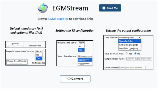 The core functionality of the EGMStream has been enhanced while maintaining its user-friendly nature and minimising the number of user inputs required. Indeed, the webapp structure involves downloading a textual (.txt) file from the EGMS Explorer and configuring several parameters to initiate the extraction and conversion of EGMS data. Once the process is completed, the user receives an email for downloading the converted data (Figure 1).