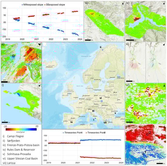 Figure 4. Visualisation of the EGMS products, converted using the webapp and displayed through a GIS platform, for different areas of interest affected by various geohazards, both anthropogenic and natural: (i) the volcanic area of Campi Flegrei, Gulf of Naples (Italy); (ii) the landslide in the southern Sørfjorden, Tromsø municipality (Norway); (iii) the subsiding area of Firenze-Prato-Pistoia basin (central Italy); (iv) the Rules Dam and Reservoir, Granada province (Spain); (v) the archaeological site of Solnitsata-Provadia, Varna province (Bulgaria); (vi) the mining subsidence in the Upper Silesian Coal Basin (Czech Republic); (vii) the 2021 Larissa earthquake, Thessaly region (Greece). For the cases of southern Sørfjorden and the Larissa earthquake, time series are shown for the points marked with black circles.