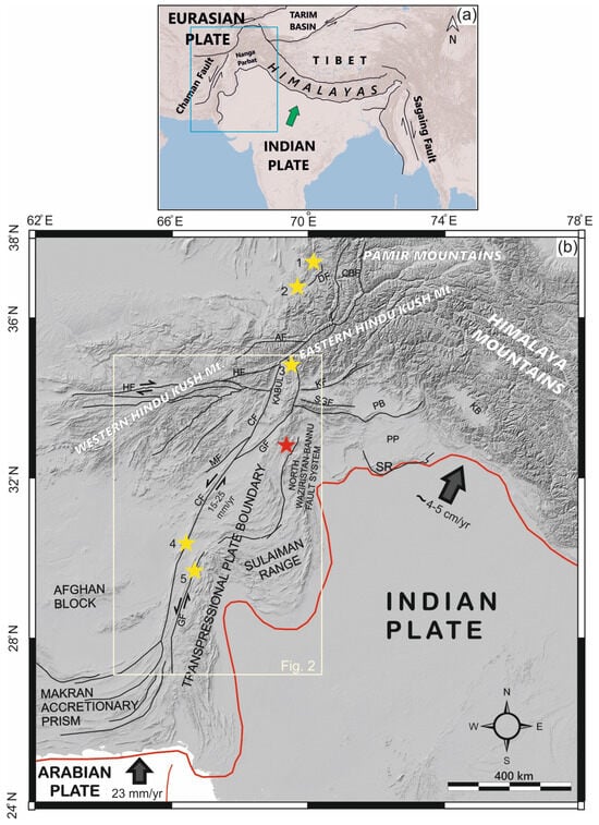 On the other hand, diffuse shortening affects the thick foredeep succession of the Tertiary Katawaz Basin, forming the so-called flysch belt, as well as the sedimentary succession developed along the Mesozoic Indian passive margin. The latter has been largely inverted and mainly detached on top of the underlying transitional-to-oceanic Indian crust, thus forming the present-day Sulaiman Range. Overall, they comprise an active transpressional deformational zone affecting this wide inter-plate setting (Figure 1). Indeed, the whole system accommodates the ~4–5 cm/yr convergence rate between the Indian and Eurasian plates [14,15,16]. The current displacement is partitioned across the plate boundary and results in seismic events and active widening of the plate boundary [17].