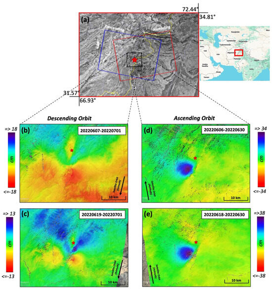 Sentinel-1A coseismic LoS displacement results relevant to the 21 June 2022 earthquake in Eastern Afghanistan: (a) indicates the Sentinel-1A footprints used to cover the area of interest (ascending orbit red line and descending orbit blue line); (b,c) show the coseismic LoS displacement maps for the descending orbit; (d,e) show co-seismic LoS displacement maps for the ascending orbit. Earthquake epicentre is shown by the red star.