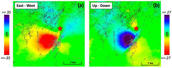 As described in Table 1, we benefited from the short revisit time (12 days) and the small spatial/perpendicular baseline separation of the S1 constellation to generate two interferograms for each orbit by using different primary acquisitions (see Figure 3). Among them, for the seismic source modelling discussed in the following sections, we selected those least affected by undesired phase artefacts (e.g., atmospheric phase delays, decorrelation noise), thereby optimizing the reconstruction of the deformation pattern affecting the area (Figure 3a). In particular, the employed S1A data were acquired on 19 June and 1 July 2022 and on 18 June and 30 June 2022 along the descending and ascending orbits, respectively. Moreover, by exploiting these displacement maps generated from ascending and descending displacement analysis, it was possible to compute the vertical and east–west displacement components [30,31,32]. The corresponding results are shown in Figure 4. In further detail, the displacement component maps reveal a maximum deformation of 27 cm of uplift and 10 cm of subsidence (see Figure 4b), while the east–west displacement indicates a maximum of 35 cm toward to the east and 14 cm toward to the west (see Figure 4a).