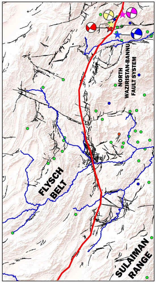 Red line shows that general trace of the fault separating the flysch belt of the Katawaz Basin in the west, which forms the NWBFS towards the north, from the Sulaiman Range in the east. The 21 June 2022 event is shown by the star symbol. Stars represent epicentres with focal mechanisms from different agencies: yellow (USGS), pink (GFZ), blue (GCMT) and red (this study). Black lines are active fault segments from Ruleman et al. [6]. Dots represent minor seismicity. For the location, refer to Figure 2.