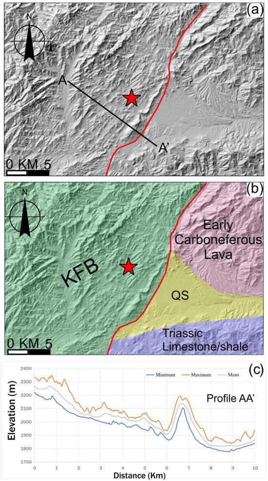 Generalized setting of the epicentral region of the 21 June 2022 earthquake (marked by the red star). The red line conforms to the trace of the active fault (a) DEM highlighting the abrupt rise in the ridge along the bend of the fault. (b) Geological map showing the ridge directly abutting against the Quaternary sediment (QS). (c) Swath profiles display the abrupt rise in the ridge in comparison to the surrounding topography. Profile line is A-A’.