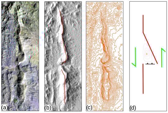 The arrangement of right-stepping fault bends forming a segmented ridge topography in a left-lateral environment: (a) as seen on satellite image; (b) as seen in DEM, the red lines follow the ridge top; (c) contours (5 m) for better visualization of topography; and (d) schematic model showing evolution of the observed fault bend and related ridge topography across the fault step-overs. The contours inside the bend show the ridge topography (high in the centre).