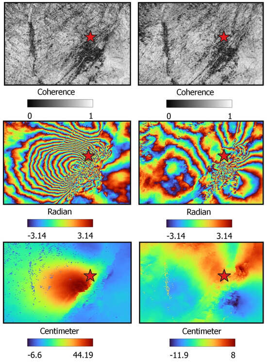 InSAR results for the 21 June 2022 earthquake, USGS epicentre shown by the red star. Results from the ascending mode (left panel) and descending mode (right panel). Coherence maps (top panel), phase change fringes (middle panel), and LoS displacement (bottom panel).