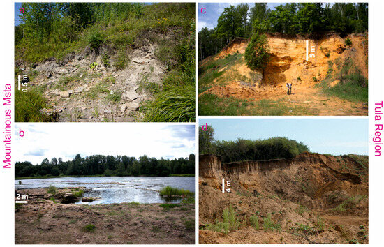 This study deals with the Mountainous Msta area and the Tula Region; these areas represent the northwestern and southern segments of the Moscow Basin, respectively (Figure 1b). The Mountainous Msta area is located near Borovichi town, and it has remained one of the classical Russian areas for Carboniferous studies for about a century [38]. The second area is located near Tula city in the center of the Tula Region, where the local geoheritage potential has already been revealed [31]. Visean deposits of these areas are typical to the related segments of the Moscow Basin (Figure 1c).