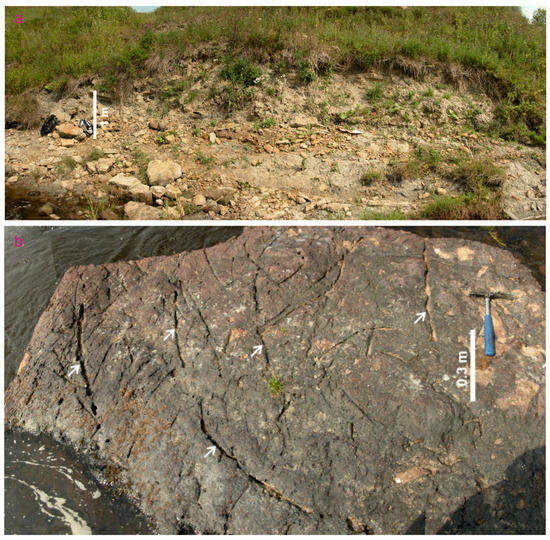 Putlino fossil plant locality: (a)—panoramic view of the principal outcrop, (b)—sandstone block with multiple plant imprints indicated by arrows. Image (b) is republished from [50]; the rights belong to Y.V.M., and permission for republication is not required.