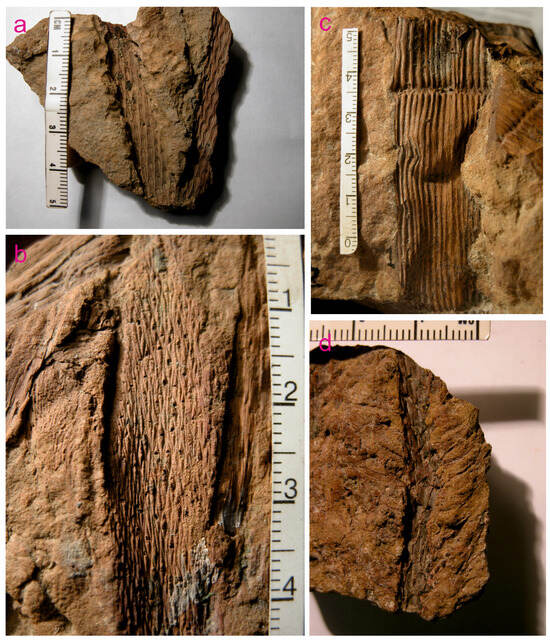 Selected fossil plants from Putlino (scales are all in cm): (a)—Bergeria puchkoviorum (Mosseichik 2017) Mosseichik 2023, (b)—Dictyastrum pentagonum Mosseichik 2014, (c)—Mesocalamites rhombicus Mosseichik 2014, (d)—Ogneuporia seleznevae Mosseichik 2004. These images are republished from [47,50,51]; the rights belong to Y.V.M., and permission for republication is not required.