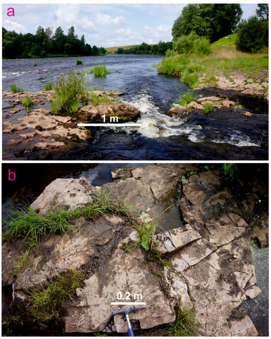 Yogla fossil plant locality: (a)—representative outcrop, (b)—close view of fossiliferous rocks with imprints of Stigmaria ficoides (Sternberg 1820) Ad. Brongniart 1822 (stigmarian limestones).