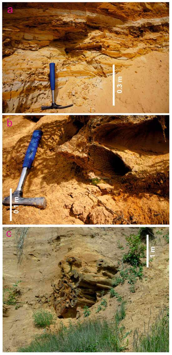 This locality is situated ~10 km west of Tula city (Figure 1b). This is a recently abandoned sand quarry near Georgievo village (Figure 2c). It has already received the official status of a protected area [31]. The exposed rocks are poorly lithified, cross-bedded, yellow and reddish-yellow quartz sands and sandstones with a visible thickness of 12 m (Figure 6a). They are attributed to the Tulskaya Formation of Visean age (Figure 1c). These deposits formed on an alluvial plain. The Visean package is overlain by thin Quaternary deposits.