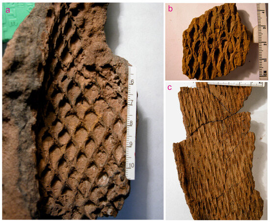 Selected fossil plants from Georgievo (scales are everywhere in cm): (a)—Bergeria puchkoviorum (Mosseichik 2017) Mosseichik 2023, (b)—Bergeria shvetzovii (Mosseichik 2003) Mosseichik 2023, and (c)—Lepidodendron veltheimioides Mosseichik 2009. These images are republished from [31,47,54]; the rights belong to Y.V.M., and permission for republication is not required.