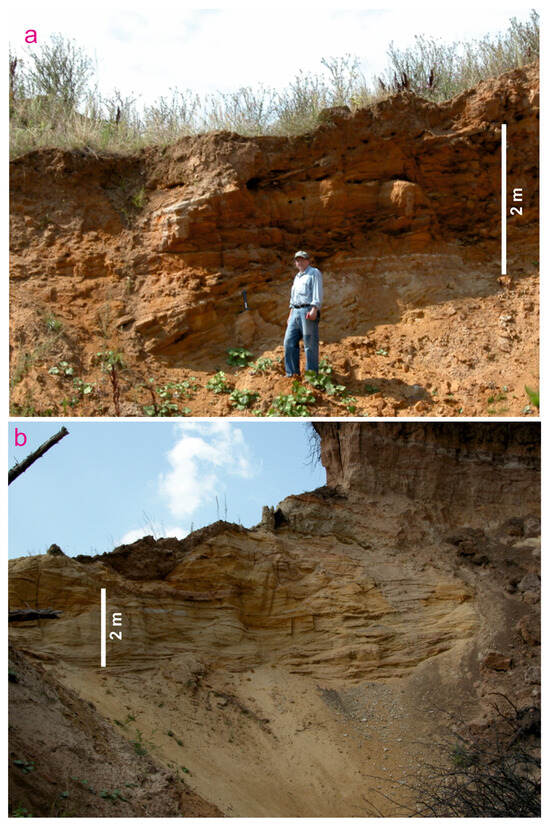 This locality is situated 3 km west–southwest of Schyokino town, near the northern periphery of Krutovka village (Figure 1b). This is also a recently abandoned sand quarry, where poorly lithified, cross-bedded, yellow and reddish-yellow quartz sands and sandstones (~10 m) are exposed (Figure 2d and Figure 8a,b). These deposits are attributed to the Tulskaya Formation of Visean age (Figure 1c). They were accumulated on an alluvial plain. Thin Quaternary sediments cap the local sedimentary succession.