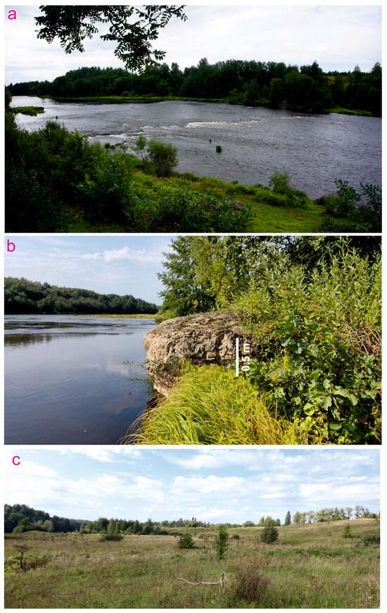 Natural scenery of Mountainous Msta area: (a,b)—picturesque landscapes along the Msta River (a also depicts the Yogla cataract), (c)—hilly landscapes of the adjacent parts of the Russian Plain.
