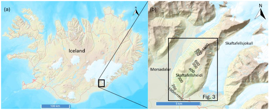 (a) Topography of Iceland, and (b) Skaftafellsheiði in southeast Iceland. Adapted from [13].