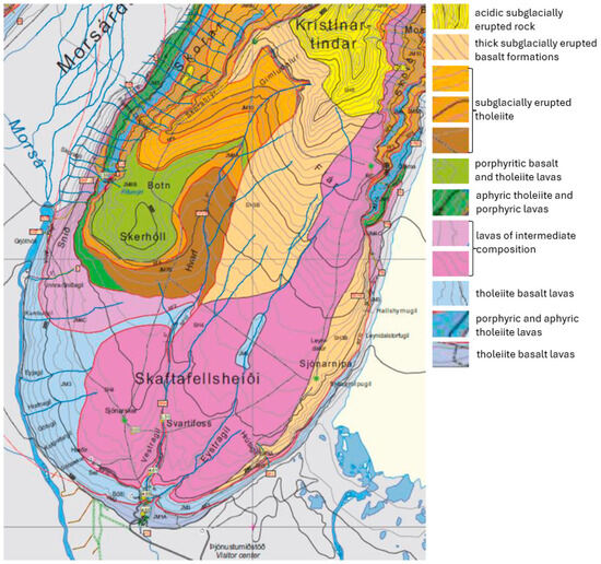 - Helgason, J. Bedrock Geological Map of Skaftafell, SE-Iceland; Geological Consulting: Reykjavik, Iceland, 2007. [Google Scholar]