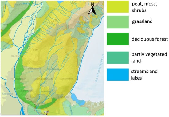 Land cover at Skaftafellsheiði predominantly consists of low vegetation, with some small trees near the catchment outlet. Most vegetation belongs to the categories of peat, moss, and shrubs. The leaf area index (LAI) for these types of vegetation is low. The vegetation cover was described in detail in the 1980s [12] and confirmed during the field campaigns in 2016 and 2023. At the lower ranges (100–200 m + msl), a low deciduous forest was found (Betula, Salix, Sorbus), followed, in the range of 200–300 m + msl, by peaty soil covered with dwarf shrubs (Betula, Salix, Juniperus) and mosses. Figure 4 shows the vegetation zones [21].