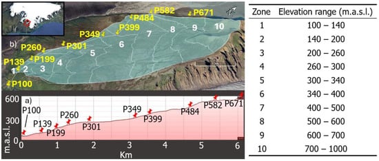 Precipitation (P) was measured by using handmade totalizers (rain gauges). In the 2015 field campaign, in total, seven rain gauges were installed to quantify the orographic effect of precipitation at Skaftafellsheiði [24]. One rain gauge was installed at the Skaftafell campsite, at the foot of Skaftafellsheiði (100 m + msl). This rain gauge was considered the home base rain gauge and was measured on a daily basis. Further uphill, gauges were installed at 300, 500, and 700 m + msl, with a gauge further east and another gauge further west at every elevation. These rain gauges were measured at three-day intervals. In 2023, in total, 10 rain gauges were installed. They were placed on the west side of the basalt dome, in a relatively straight line with elevations of 100, 140, 200, 260, 300, 350, 400, 480, 580, and 680 m + msl. For all rain gauges, P-zones were defined with an elevation range and an area. The rain gauges and linked elevation ranges are presented in Figure 5. The gauges at 100, 140, 200, 260, 300, 350, and 400 m + msl were measured on a daily basis, while the gauges at 480, 580, and 680 m + msl were measured every three days. In order to generate daily precipitation data, the higher elevation zones were calculated by computing the correlation with their closest rain gauge. Through this correlation coefficient, the cumulative 3-day precipitation was distributed over these 3 days.