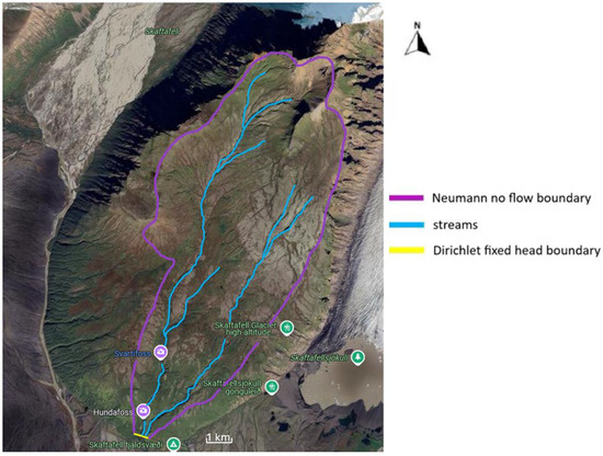 On the flanks of Skaftafellsheiði, numerous small streams can be observed (see also Figure 3). These streams appear to be draining predominantly the peat and the upper basalt formation. This was acknowledged during the field campaigns, where hardly any water seemed to come from springs in the deeper basalt layers. Therefore, we can safely assume that the topographical boundary coincides with the hydrological boundary.