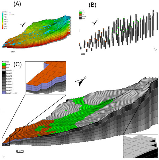 Reported hydraulic conductivities (kh and kv) for fractured and weathered basalts vary between 10−4 and 102 m d−1, with the highest conductivities found in Hawaiian basalt formations [19]. To narrow down this wide range for this study, fracture density and fracture width measurements were collected at waterfalls such as Svartifoss, at the flanks of the basalt dome, where the older basalts surface, and at Reynisfjara. For Skaftafellsheiði, it was expected that the REV would be at least 10 times the column diameter, as the spatial uniformity of the basalt columns is mostly unknown. This resulted in an estimated REV of 10m3 [35]. Due to the structure of columnar basalt jointing, strong anisotropy occurs, with a relatively low kh and a relatively high kv within the basalt formation. For the upper layers (basalt 1 and 2), kh was set to 0.3 m d−1 [36]. This kh is in line with the expectation that, due to the lower horizontal pressure, the fissures are more open than at greater depth. Due to higher pressure on the fractures, and, therefore, a smaller fracture width in the deeper basalt layers, the kh and kv of these layers (basalt 3 to 7) were set to 0.01 m d−1 [19,37]. At the southern tip of the model, in the top basalt layer (basalt 1), the kh was increased to 12 m d−1, in line with the values found at Svartifoss. This adjustment helped avoid flooded cells in the model and was justified by the fact that this layer is surfacing at the outlet, thus exerting reduced horizontal pressure on the basalt columns, creating wider voids. On top of the basalt formations, thin layers of peat, regolith, and/or soil were added in accordance with field observations. The kh and kv were taken as 5 m d−1 for the organic soil layer and peat layer and as 10 m d−1 for the regolith layer. Figure 7 provides an overview of the MODFLOW model setup with its topography and model layers. Imaginary drillings were used to force MODFLOW to produce a representative representation of the formations up to the model base at 90 m + msl. Table 3 lists the materials and physical properties of the model layers. The initial model was calibrated with PEST, i.e., a parameter estimation module to obtain optimized sets of parameters. For this optimization, initial values, minimum values, and maximum values were chosen [29]. As can be seen in Figure 7C, the basalt formations decrease in thickness downhill from Skaftafellsheiði. Additionally, a sensitivity analysis was conducted after model calibration. This showed that the kh of the peat layer and the basalt layer had the greatest influence on the model results.