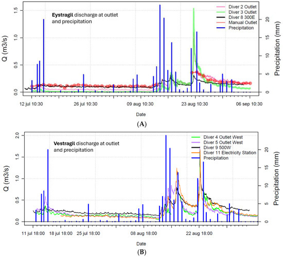 Discharge (Q) and precipitation and discharge of (A) Eystragil and (B) Vestragil during the 2015 field campaign.