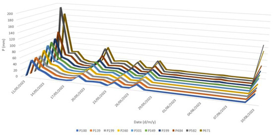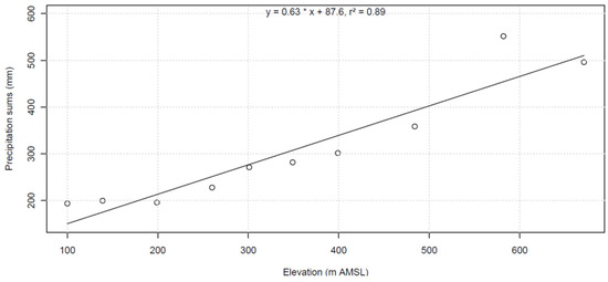 Figure 10 shows the cumulative precipitation per rain gauge at the selected elevations for the period of 11 May–11 June 2023. In the range of 100–200 m + msl, there was no noticeable increase in P with increasing elevation. Upward of 200 m + msl, the precipitation began to increase. At the highest altitudes, the cumulative P was more than twice the P at 110 m + msl. This is in line with the findings of Hannesdóttir et al. [38].