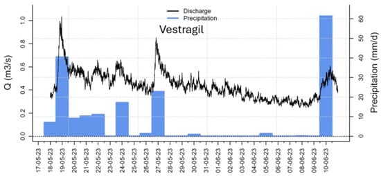 In 2023, the discharge of the Vestragil and Eystragil reacted clearly to the larger P-events on 18 May (20 mm at 100 m + msl), 27 May (15 mm), and 10 June 2023 (35 mm). The Eystragil and Vestragil total discharge was approximately 1 × 106 and 2 × 106 m3 for the period of 18 May–10 June 2023 (Figure 11). While during the 12 July–6 September 2015 field campaign a clear storage effect was found, no such effect was recorded during the 9 May–11 June 2023 campaign. This can be linked to the difference in timing of the field campaigns, i.e., Icelandic summer in 2015 and Icelandic spring in 2023.