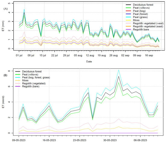 Evapotranspiration varies strongly per vegetation zone, and, thus, also across different elevation zones. Figure 12 shows ETpot for the 2015 (Figure 12A) and 2023 (Figure 12B) campaigns, respectively. In 2023, the calculated ETpot for peat (bog), peat (forest), and peat (grass) yielded identical results. Therefore, only peat (grass) is shown in the figure. Different crop factors (Kc) and different land coverages (fc) resulted in differences in ETpot. In the higher areas with bare regolith, vegetated regolith, and moss coverage, the ETpot was always significantly lower than 2 mm d−1. The lower altitudes with peat and/or deciduous forests had a much larger ETpot. The relative high values are caused by relatively high temperatures in combination with relatively low humidity and long daylight periods. For the 2015 campaign, the total calculated ETpot was 0.66 × 106 m3, while for the 2023 campaign it was approximately 0.5 × 106 m3.