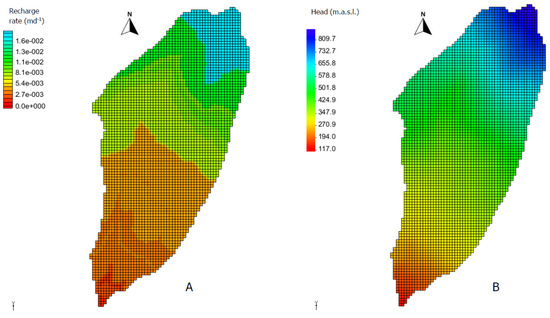 (A) Recharge rate (m d−1) and (B) calculated head in the stationary model.