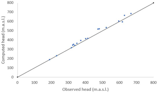 Observed heads during the field campaigns versus the groundwater levels computed with MODFLOW. Dots below the 1/1 line indicate an excessively low computed water head, while dots above the 1/1 line indicate an excessively high computed water head.