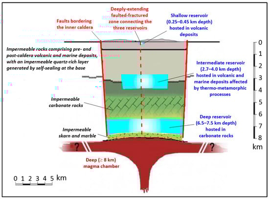 - An impermeable unit made up of skarn and marble (7.5–8.0 km depth) generated by thermometamorphic and metasomatic processes and behaving as an aquiclude due to their nil porosity [56].