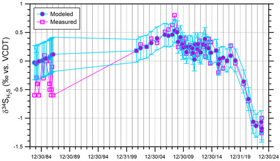 Exceptions are mostly samples from the time interval 1983–1987, all but one collected by Allard et al. [78], which have values lower than predicted by the model, and the sample obtained on June 11th, 2008, which has a value slightly higher than that computed by the model. As already noted above, for the early samples, it is probable that elemental S or the S stored in sulfide/bisulfide and/or sulfate minerals was remobilized and entered the magmatic–hydrothermal gas flow due to heating of the Solfatara magmatic–hydrothermal system [77,78]. Accepting this explanation for the discrepancies between the modeled and measured values of early samples, it can be concluded that magma degassing and SO2 disproportionation in the deep hydrothermal reservoir satisfactorily explain the sulfur isotope data of Bocca Grande fumarolic effluents.