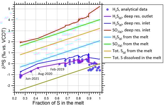 - Hydrogen sulfide in the gas mixture separated from the melt, which decreases from +2.10 to −0.30‰ and has an exact linear relationship with F, constrained by Equations (9), (16) and (17).