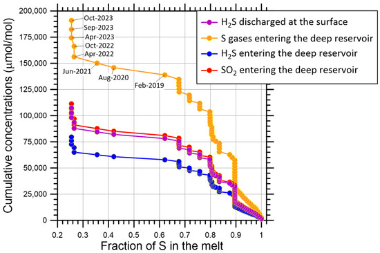 Further details on the results of our model are shown in the diagram of Figure 4, in which the fraction of S remaining in the melt is used as a reference variable because it describes the extent of the magma degassing process.