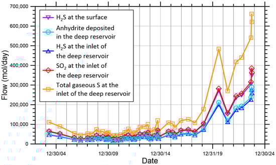in which is the value given by Equation (7). Equations (20) and (21) were used to compute the molar fractions of H2S and in the deep hydrothermal reservoir.