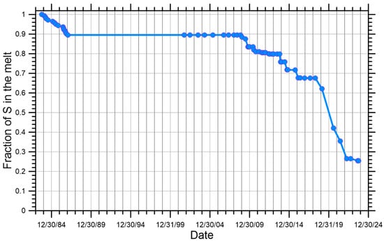 As already recalled in Section 3.4, the melt at depths ≥ 8 km was assumed to be at constant temperature, T = 1120 °C; constant pressure, = 2879 bar; and constant = −8.28, at all degassing steps, while the initial δ34S value of the melt was assumed to be 0 ‰, which is the pristine mantle value. Therefore, the only unknown, at each degassing step, is the fraction of S remaining in the melt, F. Thus, the data of Caliro et al. [15], apart from the 10 data of the period August 1998–March 2001, and the data of Allard et al. [78] were ordered by sampling date, from the oldest to the most recent, and the value of F, at each degassing step, was changed iteratively until the at the outlet of the deep hydrothermal reservoir given by Equation (22) resulted in being equal to the corresponding value measured in the Bocca Grande fumarolic effluents, within analytical uncertainty. For F ≤ 0.7, the error on F ranges between 0.129 and 0.038 units, with an average value of 0.064 units. For F > 0.7, the error is higher and difficult to define due to the considerable oscillations of the analytical values.