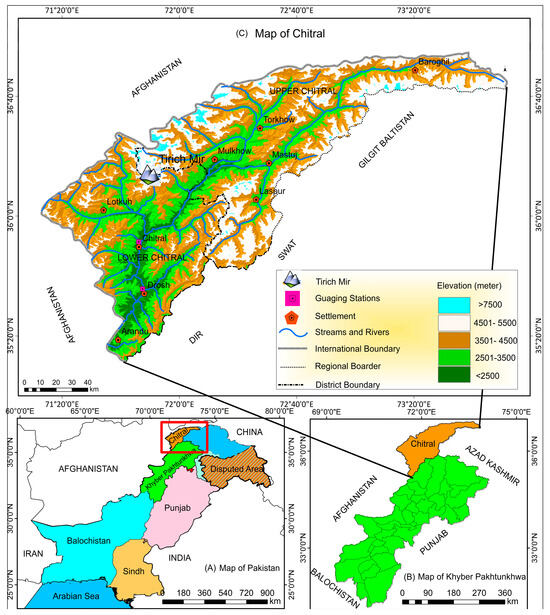 Chitral (35–37° N, 71–74° E) is the northernmost valley of the Khyber Pakhtunkhwa province in the northwestern part of Pakistan (Figure 1). It is referred to as “the heart of the Hindu Kush” and “the land of fairies and flowers” [33]. The Hindu Kush Range has several peaks over 7000 m, with Tirich Mir (7708 m asl.) being the highest. It is also the tallest peak in the world outside the Himalayas and Karakoram. Chitral has over 500 glaciers, of which Chiantar (36 km), Tirich Mir (32 km), Booni, and Raman are the most famous ones. The Raman Glacier is situated in the Laspur Valley at an elevation of 5500 m asl. Chitral is administratively divided into Lower Chitral and Upper Chitral districts, covering an area of 14,850 km2. In 2023, the valley was home to almost 516,000 people; its population density is thirty-five persons per square kilometer [34].