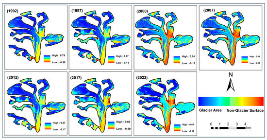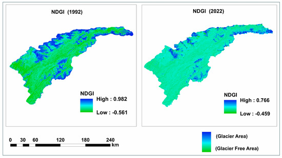 The Normalized Difference Glacier Index (NDGI) was used for the spatiotemporal analysis of clean-ice glacier areas [37]. NDGI is a spectral index specifically designed to identify and delineate glacier areas based on their unique spectral properties. It is calculated as: NDGI = (Near Infrared − Green)/(Near Infrared + Green). The green band highlights glacier ice due to its high reflectance, while the shortwave infrared band helps distinguish ice from the surrounding terrain. Pixels with an NDGI value greater than the threshold of 0.4 were classified as glacier ice. Since only clean ice was mapped, the results present the minimum total glacier area. However, debris-covered glaciers are relatively rare in Chitral.
