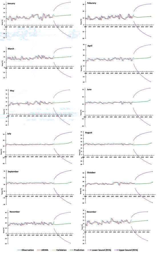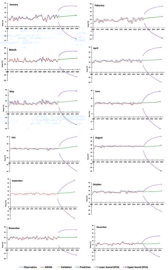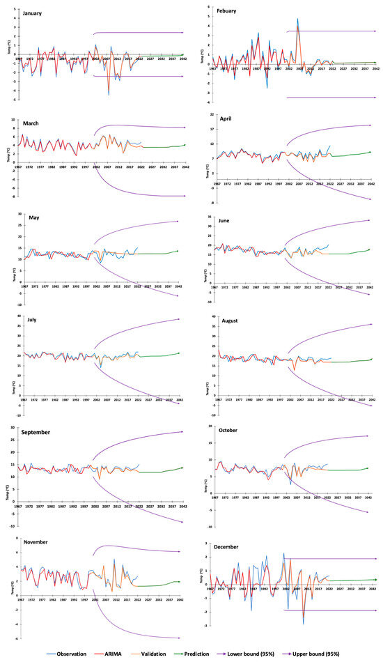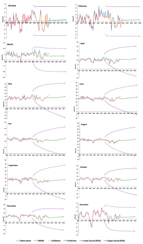 where is the observation taken at time t. After determining the orders and estimating the coefficients for the temperature and precipitation time series data by fitting the model, point forecasts and interval forecasts were generated using Equation (7).