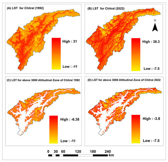 Changes in land surface temperature (LST) in Chitral from 1992 to 2022.