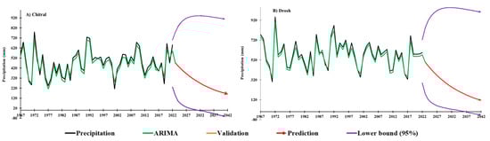 The ARIMA results revealed variations in annual precipitation. In Chitral city, the highest annual precipitation of 664 mm occurred in 2022, while the lowest, 73 mm, was recorded in 1997, indicating a relatively large range (Figure 9). The 56-year mean annual precipitation was 258 mm, with a standard deviation of 130 mm. The analysis identified a trend of decreasing annual precipitation from 1967 to 2022. In Drosh, the highest annual precipitation of 952 mm occurred in 1972, while the lowest, 302 mm, was recorded in 1971. The mean annual precipitation was 577 mm, with a standard deviation of 135 mm. Annual precipitation fluctuated significantly and showed a decreasing trend between 1967 and 2022, with projections suggesting that this trend will continue from 2022 to 2042.