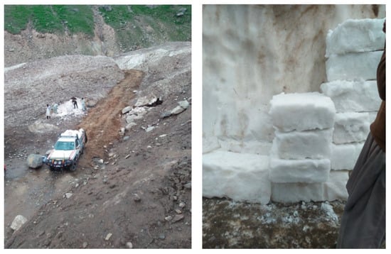 Over the past decades, illegal harvesting and commercial exploitation of snow and glacier ice have become significant economic activities in Chitral (Figure 10). According to interviews and focus group discussions with local ice sellers, forty to fifty vehicles transport harvested snow and ice to Chitral town daily from May to September. This activity is managed by various contractors, who collect the snow and ice from different locations around Lawari Pass. Each vehicle carries between 45 and 55 nuks (approximately 40 kg), resulting in a total daily harvest of between 72 and 110 tons of snow and ice. Over the five-month harvesting season, this amounts to between 10,800 and 16,500 tons, or roughly 12 to 18 million cubic meters. Snow and ice are also harvested from other areas in Upper Chitral, such as Attakh and Tirich. With rising temperatures during the summer, more frequent heatwaves, and electricity load shedding, the demand for snow and ice has increased. Local vendors sell the snow and ice for domestic use at a rate of PKR 100 (~35 US cents) per kg.